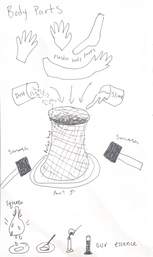Dust God and Slime God close the bag and grab mallets and start crushing the plaster body parts in with the other compounds. They do this over a large pan[think of the acoustics!] so that anything that oozes out is contained and then collected after the extraction. They put the resulting concoction in a measurement beaker.
