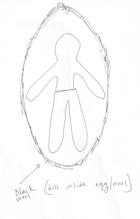 The doll is covered in a felt egg. They break the doll out from the egg together. They coddle it and hold it like mothers after birth.